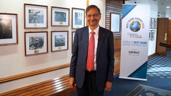 Intellect's Arun Jain unveils the world's first open business-impact AI platform, Purple Fabric, revolutionizing banking with a customer-first strategy at the 2025 Global Bank...