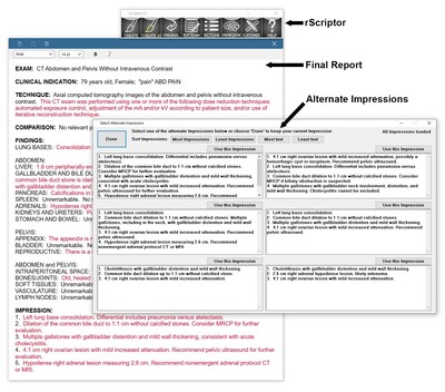 The updated rScriptor allows radiologists to customize the length of their impressions, producing either concise or detailed reports based on personal preferences. In a groundbreaking feature, the software generates six alternate impressions simultaneously using multiple fine-tuned large language models (LLMs) through parallel processing. This means that radiologists have instant access to diverse options to suit their reporting style, enhancing flexibility and reducing reliance on a single AI output.