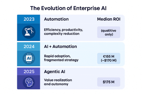 Enterprises increasingly adopt Agentic AI, with 45% projected to achieve autonomy by 2030, generating an average ROI of $175 million on AI investments.