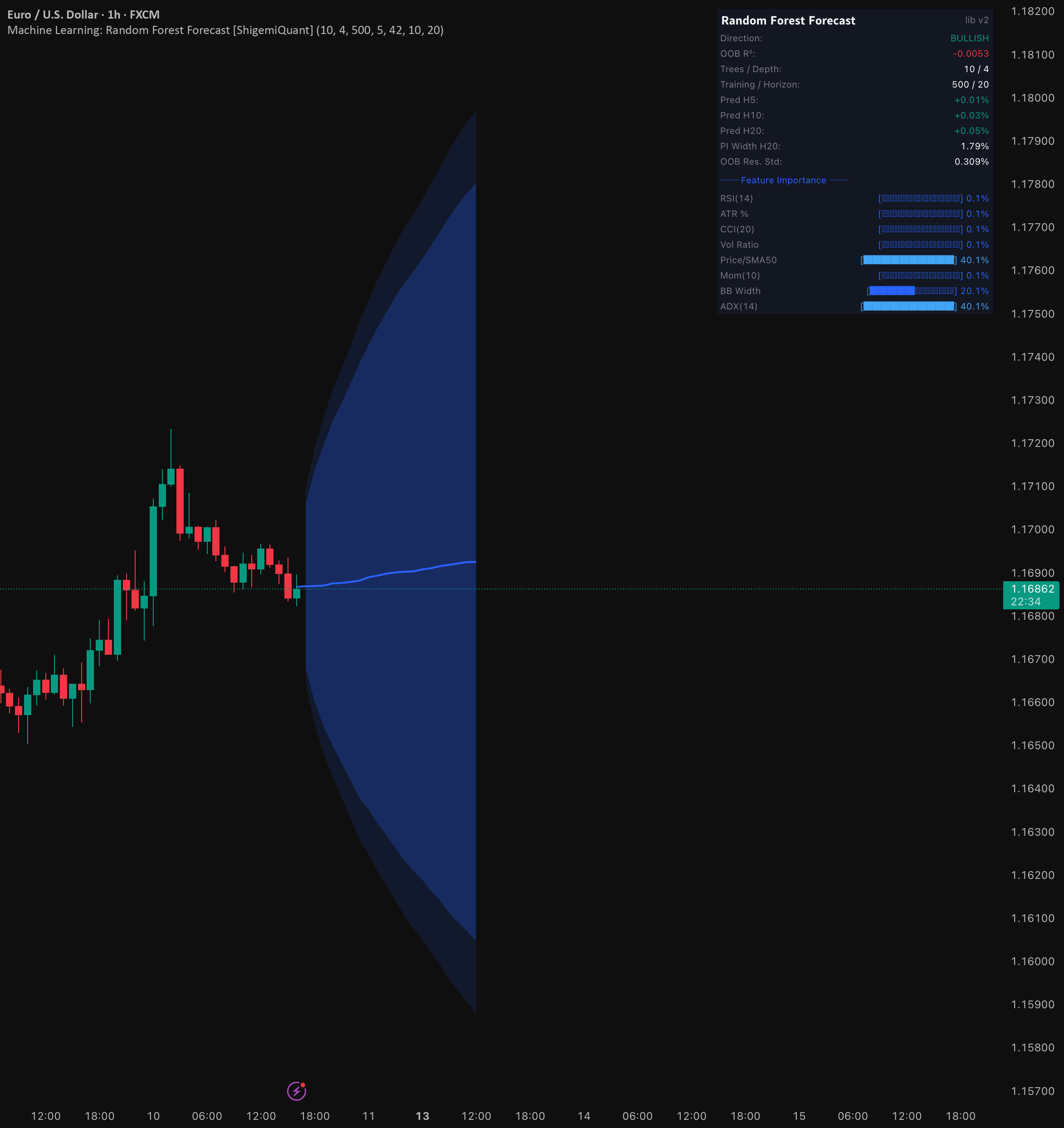 A new machine learning indicator offers traders a multi-horizon price forecast using a Random Forest model, marking a significant advancement in algorithmic trading tools. Developed with RandomForestLib, the first open-source Random Forest library for Pine Script, this tool enables users to build, train, and deploy regression-based ensemble models directly within the Pine Script environment. Its capability to generate forward-looking price predictions comes with statistically grounded prediction intervals, enhancing decision-making in volatile markets.