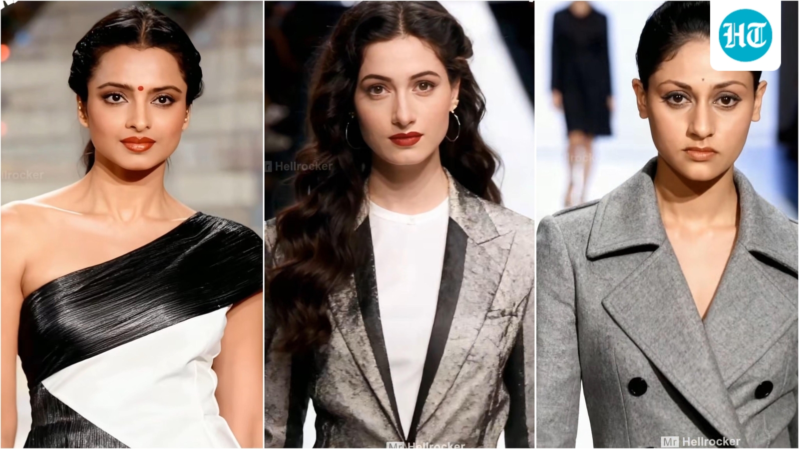 The video opens with the ever-graceful Rekha, who radiates elegance in an off-shoulder black-and-white gown, complemented by her signature red bindi and bold lipstick. Following her, a younger version of Madhubala captures attention in a sleek pantsuit, showcasing flowing curly hair that has left viewers enchanted. Hema Malini also makes an impression, wearing a fashionable blazer dress adorned with plaid patterns and notable lapels, demonstrating that classic beauty can seamlessly integrate with contemporary fashion trends.