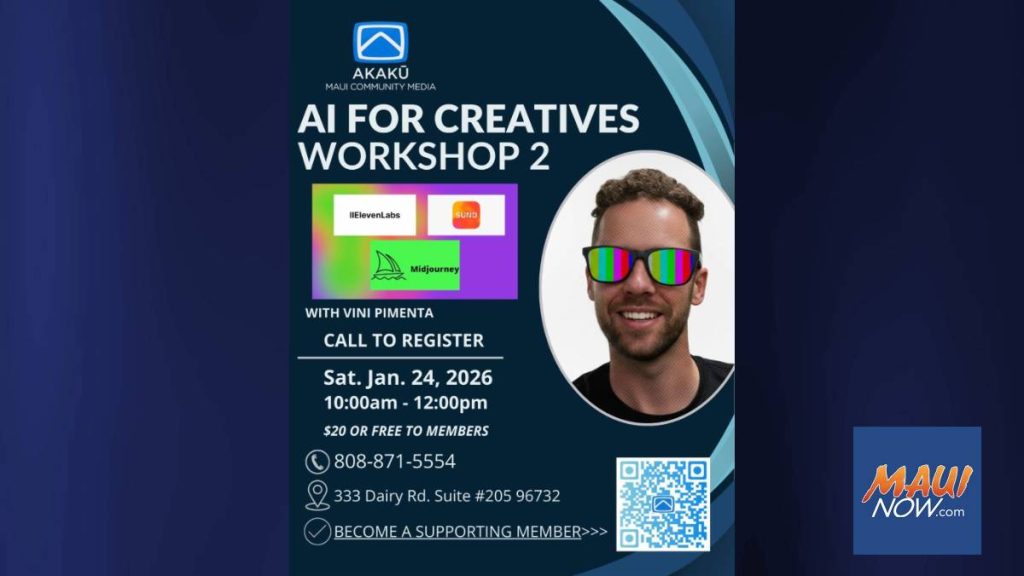 Akakū Community Media is set to host a hands-on workshop on January 24, 2026, exploring the integration of artificial intelligence in creative workflows. The session will delve into three prominent AI tools—Suno for music creation, Midjourney for visual content, and ElevenLabs for voiceovers—aimed at enhancing productivity and fostering creativity among participants.