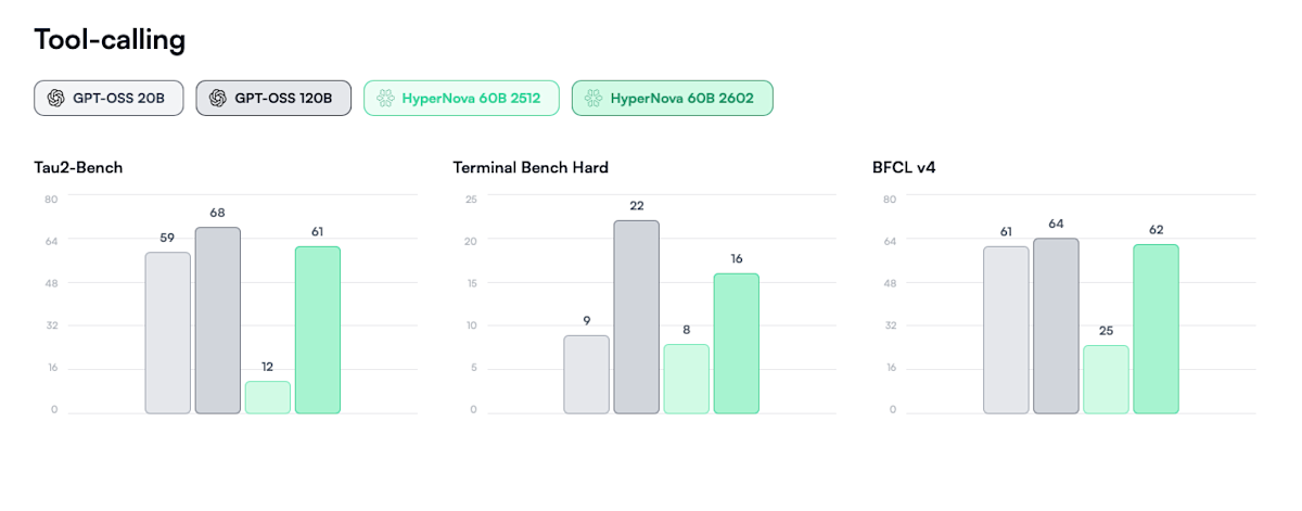 HyperNova 60B 2602 also reflects enhancements driven by real-world feedback from developers. The model is designed to facilitate advanced workflows and coding applications, showcasing significant improvements in key performance benchmarks. Notably, it features a fivefold enhancement in agentic tool use as measured by the Tau2-Bench, a twofold improvement in agentic coding and terminal use as per the Terminal Bench Hard, and a 1.5x improvement in function calling metrics according to BFCL v4.